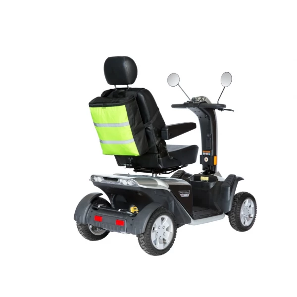 Een tas van hoge kwaliteit materiaal en slijtvaste stof. De achterkant van deze tas is voorzien van sterk fluoriserend nylon wat de bestuurder goed zichtbaar maakt. Ook zijn er twee reflecterende banden aangebracht om in het donker extra zichtbaarheid en veiligheid te bieden. Bevestiging is gemakkelijk door de brede banden aan de bovenkant van de tas, deze vallen goed over de rugleuning en zorgen ervoor dat de tas in positie blijft. Door het handvat bovenaan de tas kan hij makkelijk worden meegenomen. De tas blijft door de hoge kwaliteit nylon en stevigheid mooi in model zitten.